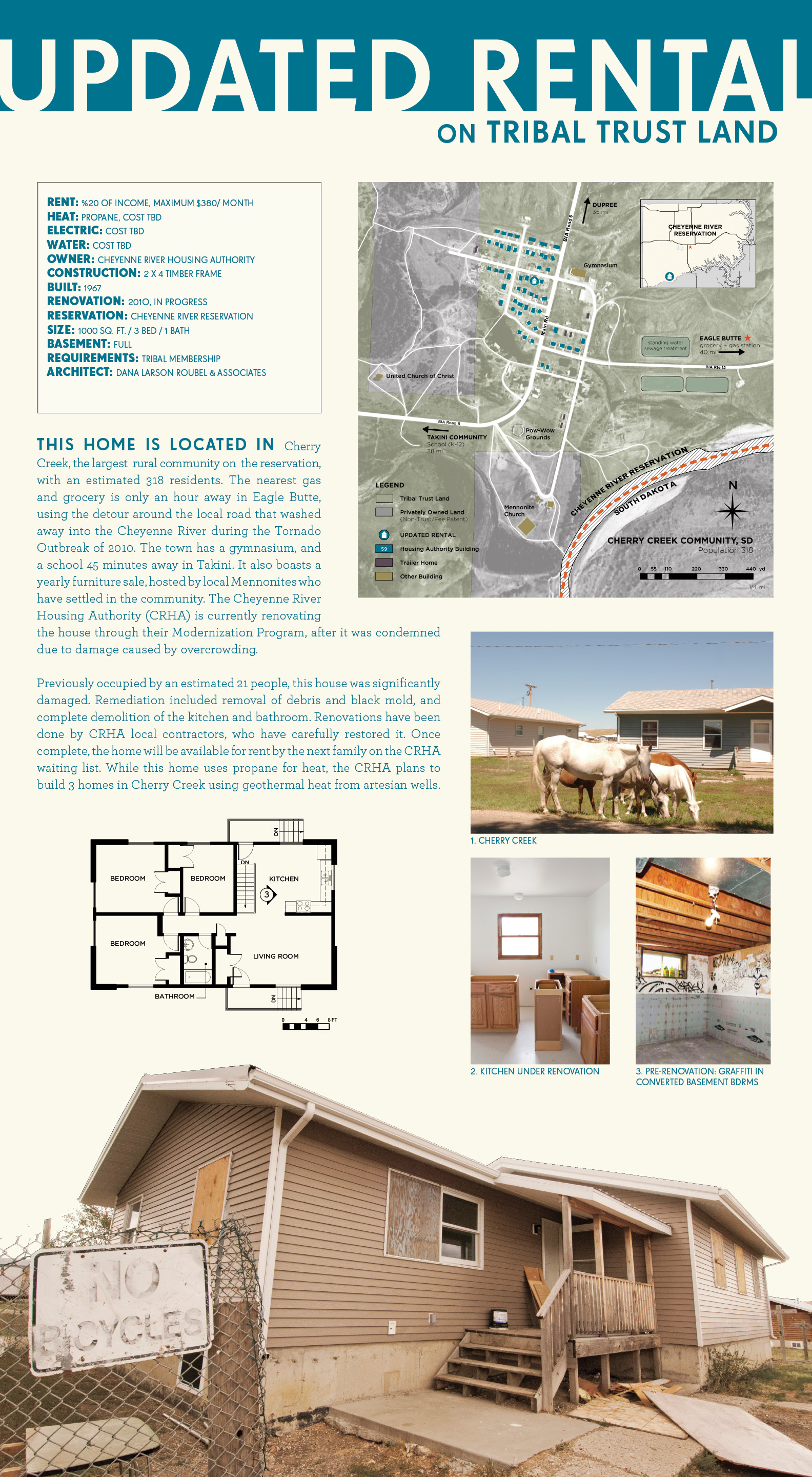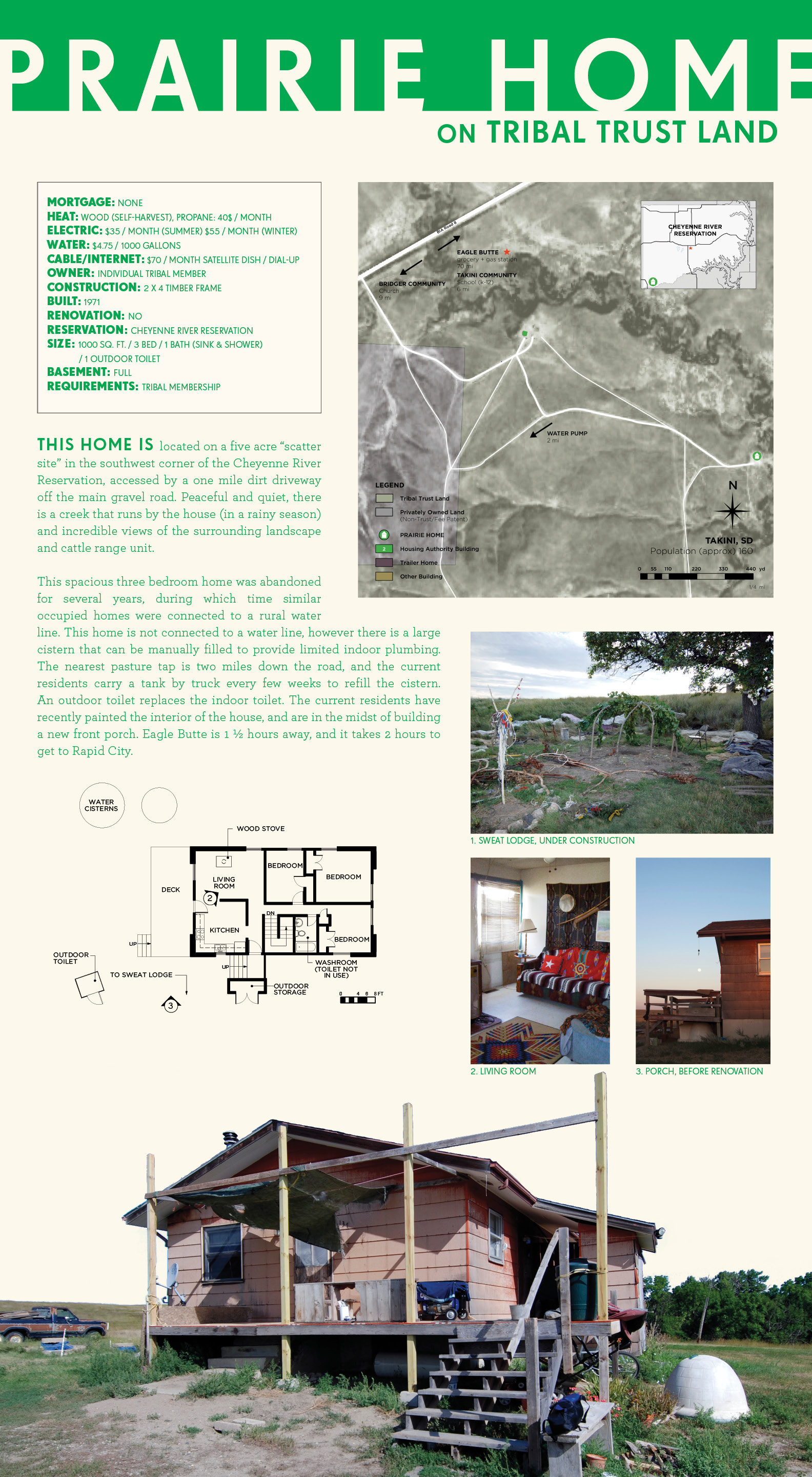 These six posters represent common housing and construction typologies on the reservation. The information on the posters was collected through interviews conducted primarily in the summer of 2010. Our research focused on the Cheyenne River Reservation, but we also saw a number of innovative building projects on the Pine Ridge Reservation. Roughly 90% of the homes on Cheyenne River were constructed by the Housing Authority (CRHA) with HUD[1] grant money. Housing for all tribal members was one of the conditions of the 1868 Treaty of Fort Laramie, the last treaty made between the US and Indian Tribes.[2]