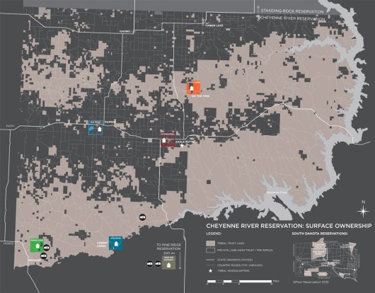 This Surface Ownership map highlights two critical issues. First, it indicates the extraordinarily complicated legal system that tribal members must navigate to own, lease or keep land in trust. Second, the map shows how land control is problematized by the fact that over 50% of the Cheyenne River Reservation has been sold off to private (non-Indian)[1] interests. This checkerboard of tribal ownership is primarily due to the 1887 Dawes Act, in which the US government allotted communal tribal land to individual tribal members, and then sold the ‘excess’ for private ownership to homesteaders.[2] This erosion of control over their land has greatly hindered the tribe’s ability to create sustainable economic activity and access resources necessary for survival and growth. Today, the majority of land along major roads—the land most suited for commerce and most fertile for agriculture and ranching—is not in trust to the tribe.